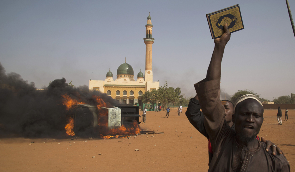 A man holds a copy of the Koran during a protest against Niger President Mahamadou Issoufou’s attendance last week at a Paris rally in support of French satirical weekly Charlie Hebdo, which featured a cartoon of the Prophet Mohammad as the cover of its first edition since an attack by Islamist gunmen, in Niamey January 17, 2015. REUTERS/Tagaza Djibo (NIGER – Tags: RELIGION CIVIL UNREST POLITICS MEDIA TPX IMAGES OF THE DAY)