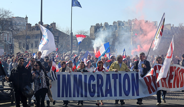 A few hundred people demonstrate against immigration and Islamism in Paris, Sunday March 9, 2014. Sign reads: Immigration, Referendum. Far right organisations called for this demonstration asking the French government to organise a referendum on immigration.(AP Photo/Remy de la Mauviniere)